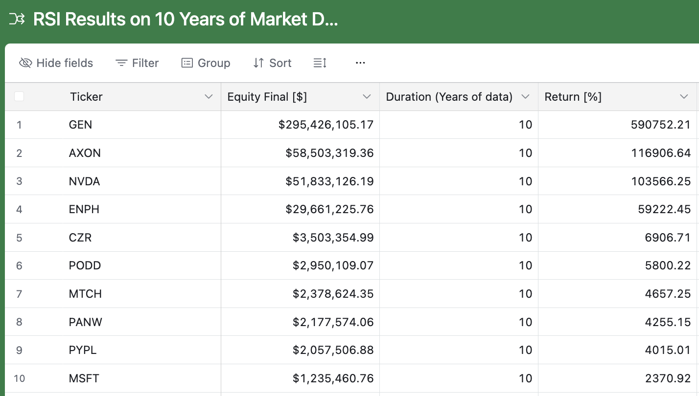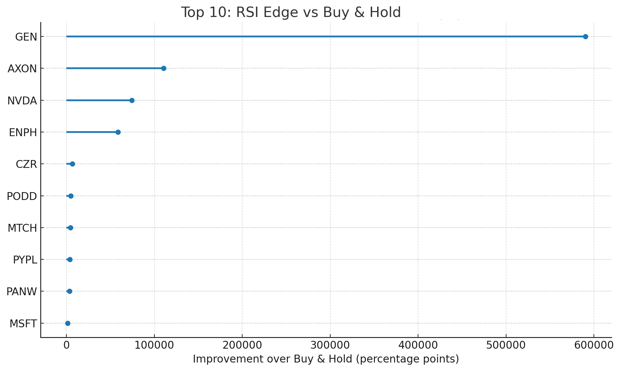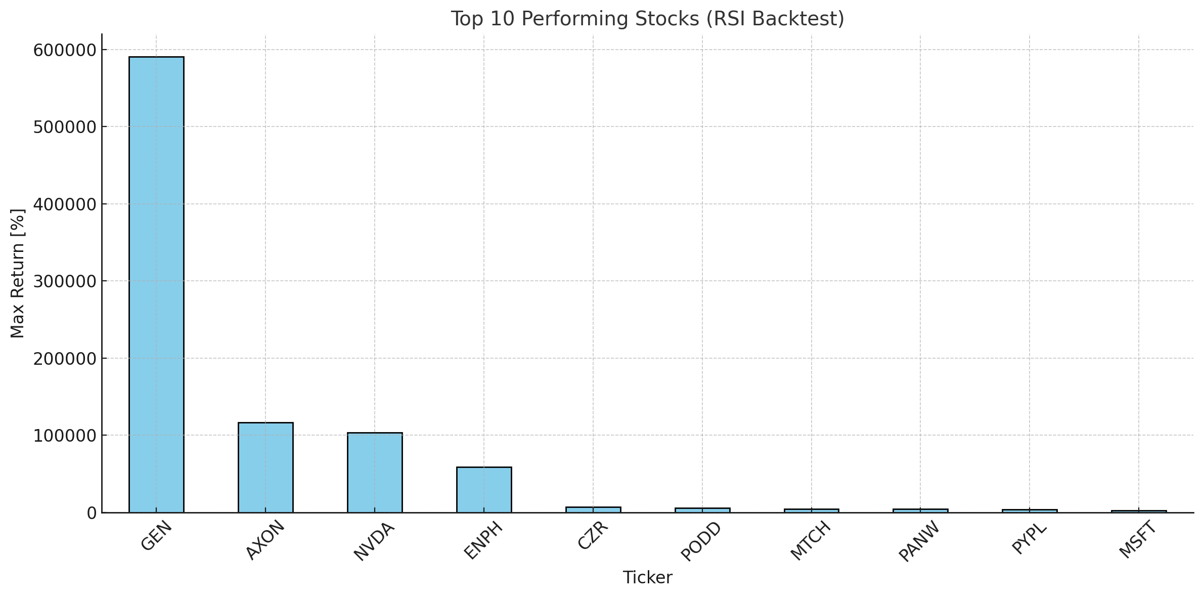 The results were impressive. For the stock GEN, the RSI strategy turned a $50,000 investment into approximately $300 million, a massive win over the simple buy-and-hold strategy.